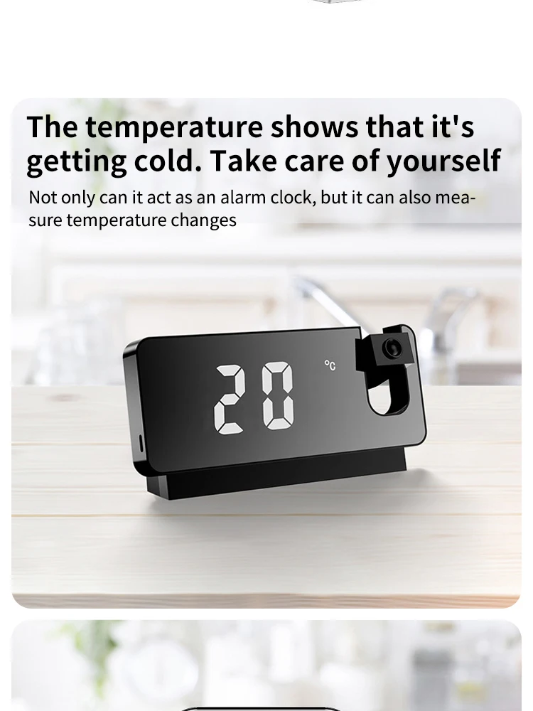 2. Adjustable Projector: With a 180° rotating projector, our clock allows you to effortlessly adjust the projection angle. You can conveniently project the time and temperature on walls, ceilings, or any desired surface for easy viewing.